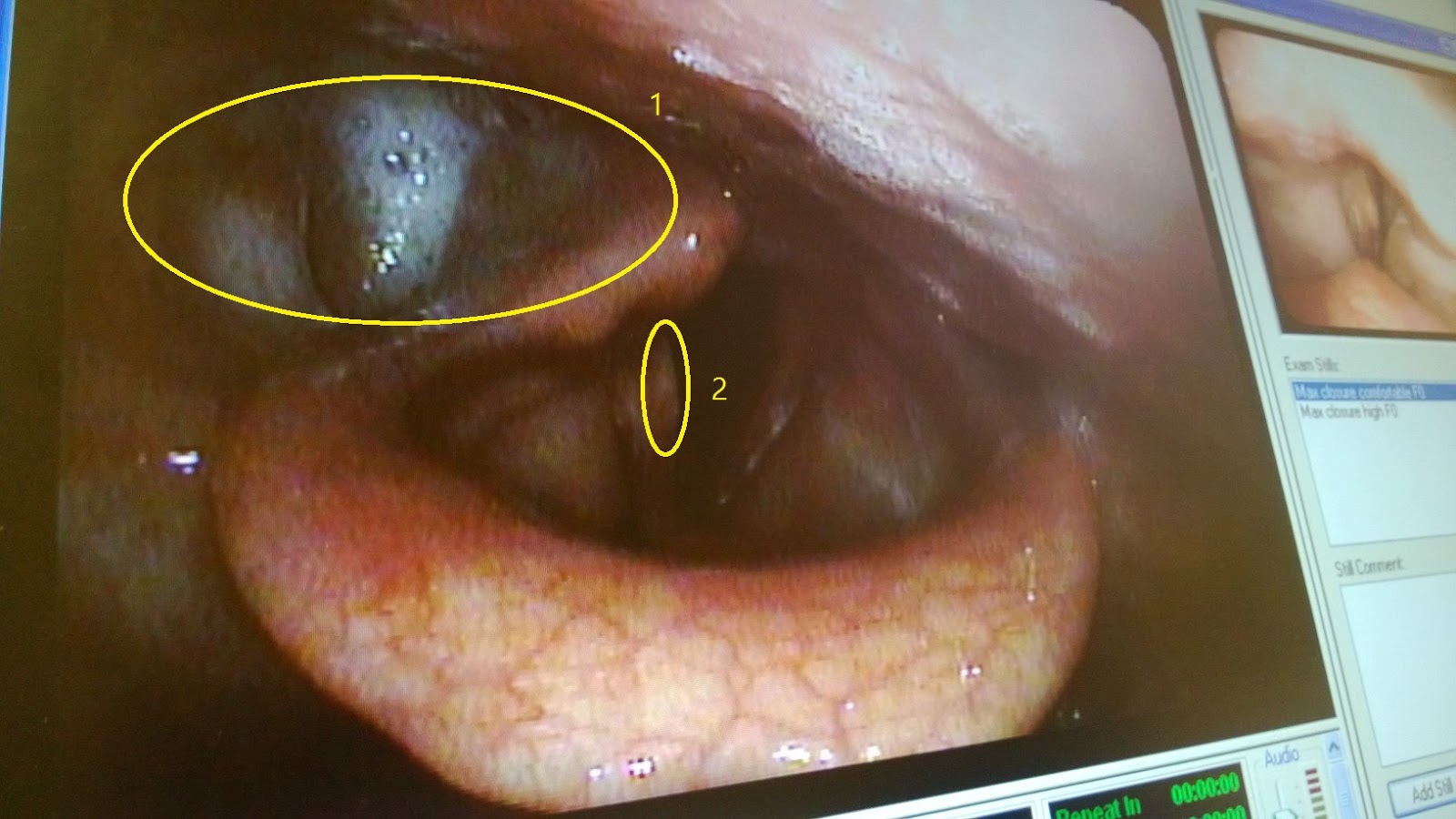 Jan has me start by making an E sound for as long as I can, hum the birthday song, a couple different phrases, a higher pitch E sound for as long as I can hold it.  Which was about 8 seconds, not very long…  All the while they’re looking at the monitor to see what my vocal folds and other areas around them are doing while I’m making these sounds.  They eventually pull the scope out and we start talking about what they were seeing.  He mentions that the right vocal fold is shot, which we all knew already.  He also mentions about something being flaccid in there., I wish I could remember what it was called!  I asked if that was a good or bad thing.  He said it’s not a good thing.  Essentially, because the muscle on the right side of my throat isn’t doing anything it’s kind of pulling away from the throat which causes what he called a “lagoon” for things to fall into.  You’ll see this in a picture that I’ll post at the end.  He then tells me that he’s really glad I didn’t get the implant done today as there’s still material from the injection I had several months ago in the vocal fold.  If I had the implant surgery today, the size of the implant would’ve been used based on the way my vocal folds are now.  Eventually, that material would dissolve like the rest of it has and I’d likely be back to where I am now to an certain extent.  We talk some more about the findings, then he leaves with Jan and the lady from Turkey and the Wet Hand lady.  The nurse then shows me the video from the scope and talks me through what they were seeing and points out the “lagoon” and the material in the vocal fold.  I’m absolutely fascinated by this.  She eventually leaves the room and I grab a picture of the monitor, the one you’ll see later.
